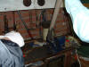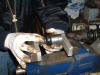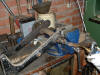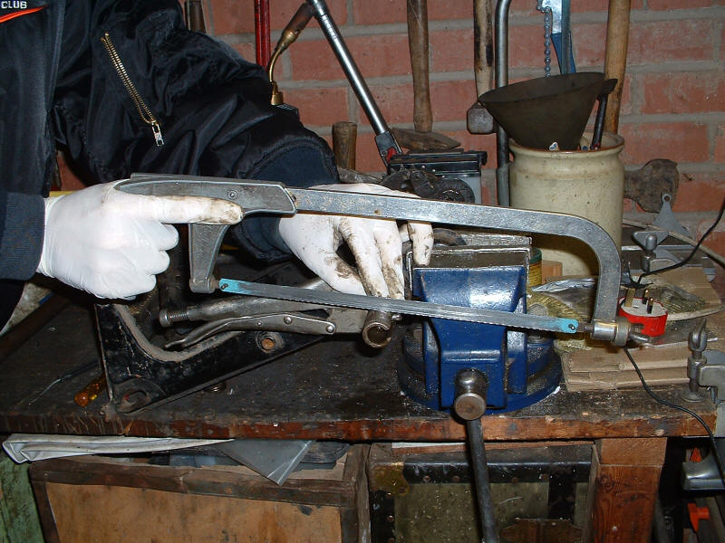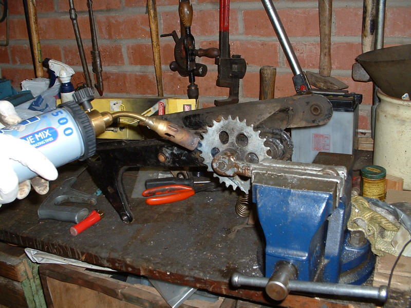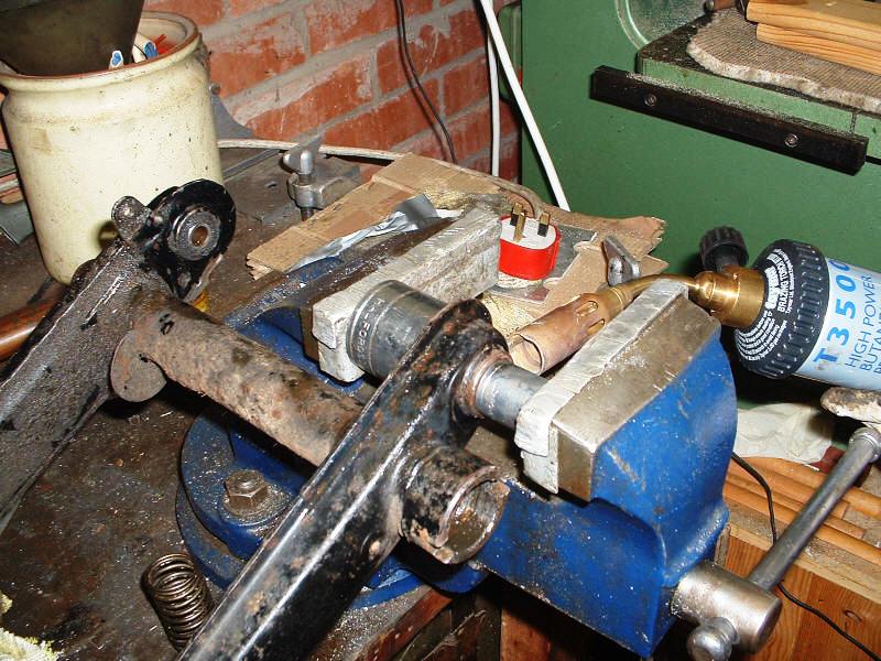 Well, I had trouble getting the pedal crank off the shaft, so I called on Tom (who shares a nice workshop with his Dad) and we set about removing it. Except we couldn't, so we applied some heat, you guessed it - no joy, so we sawed off the slotted sleeve and the little dowel at the other end. It let us slide the whole thing out from t'other side and with A LOT MORE HEAT and a big welly bar, the little sucker gave up and slid off. The swing arm bearings slid out after we used the right size socket!!