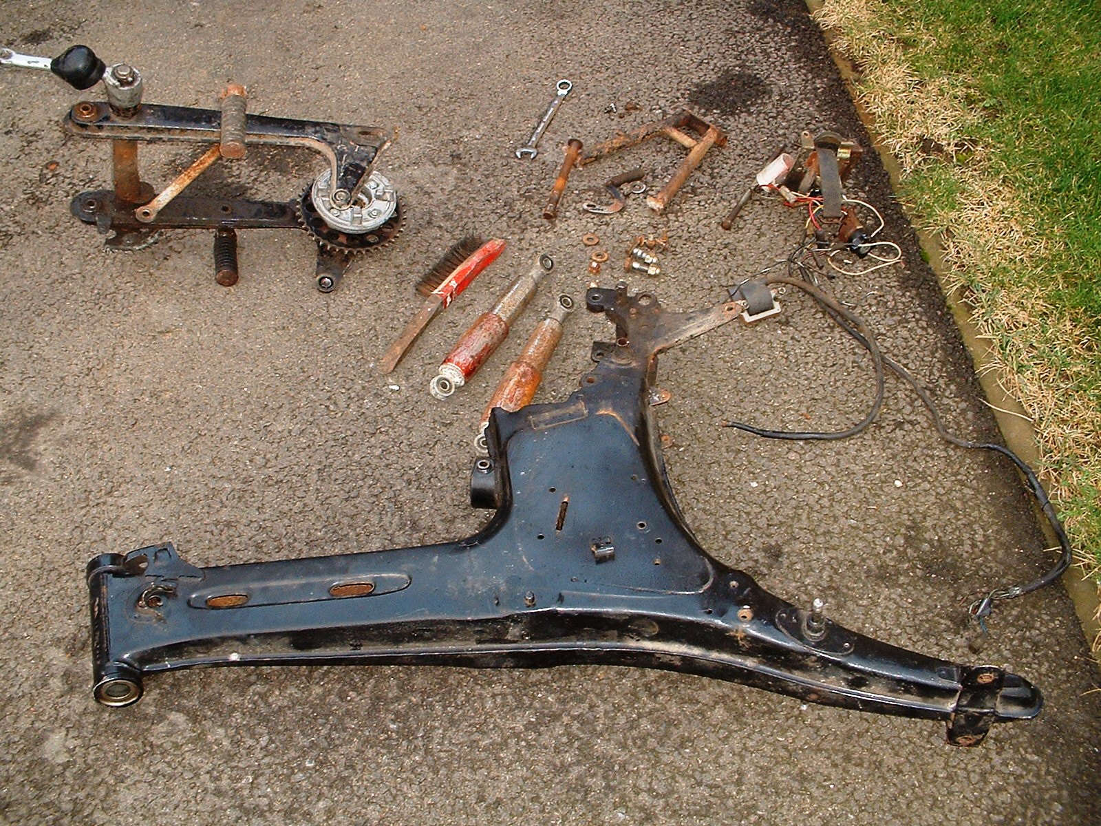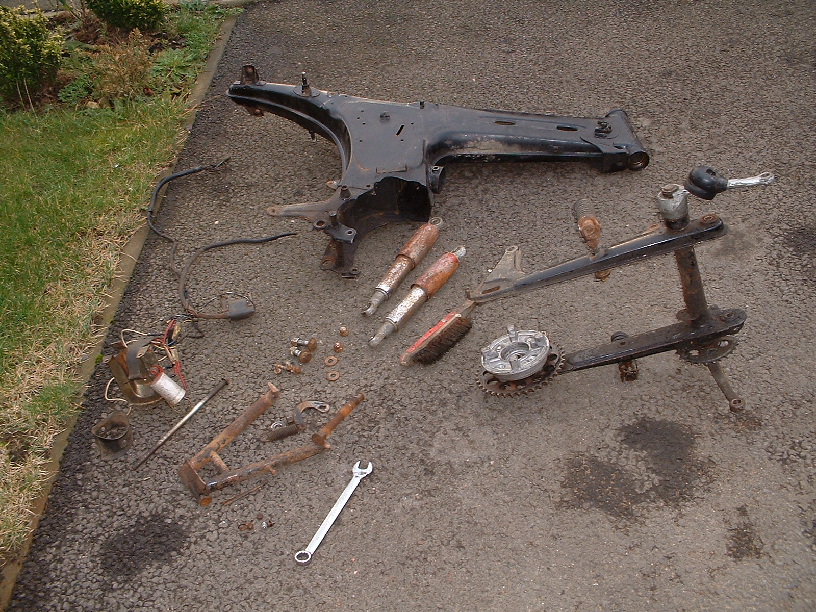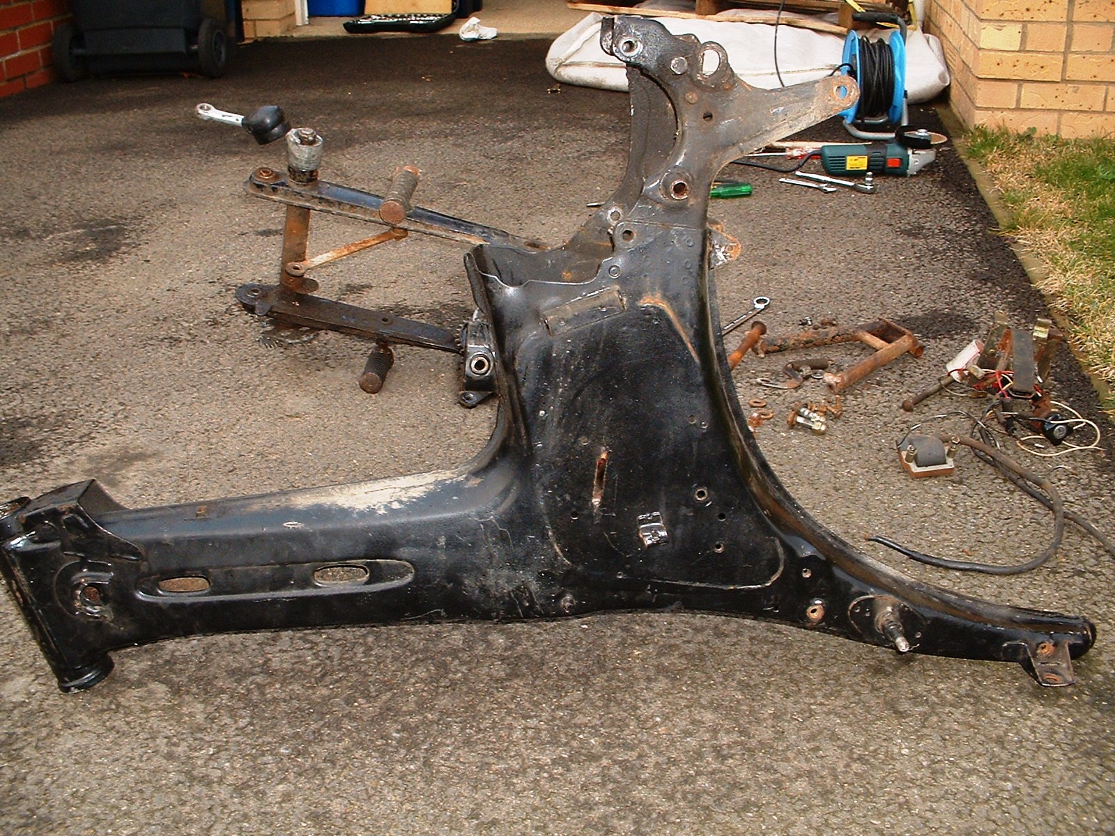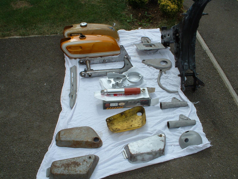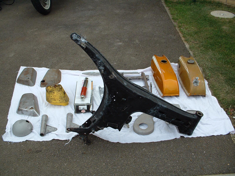 So I thought I would get busy (seeing as it wasn't actually raining) and strip the frame. I got almost there but the pedal crank shaft will not come out - time to consult the manual, after all there's no point in bashing away at it if doesn't come apart the way I think.....OK, all the bits are ready for painting (well they're going to a local paint shop) and he will give me back the frame and swing arm first, perhaps the silver bits too.