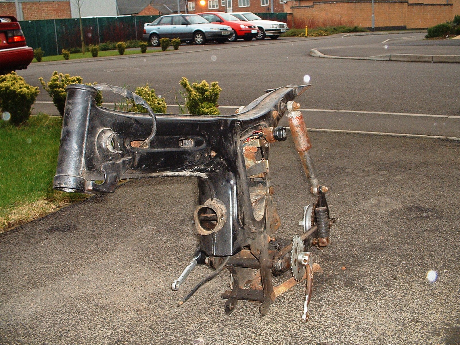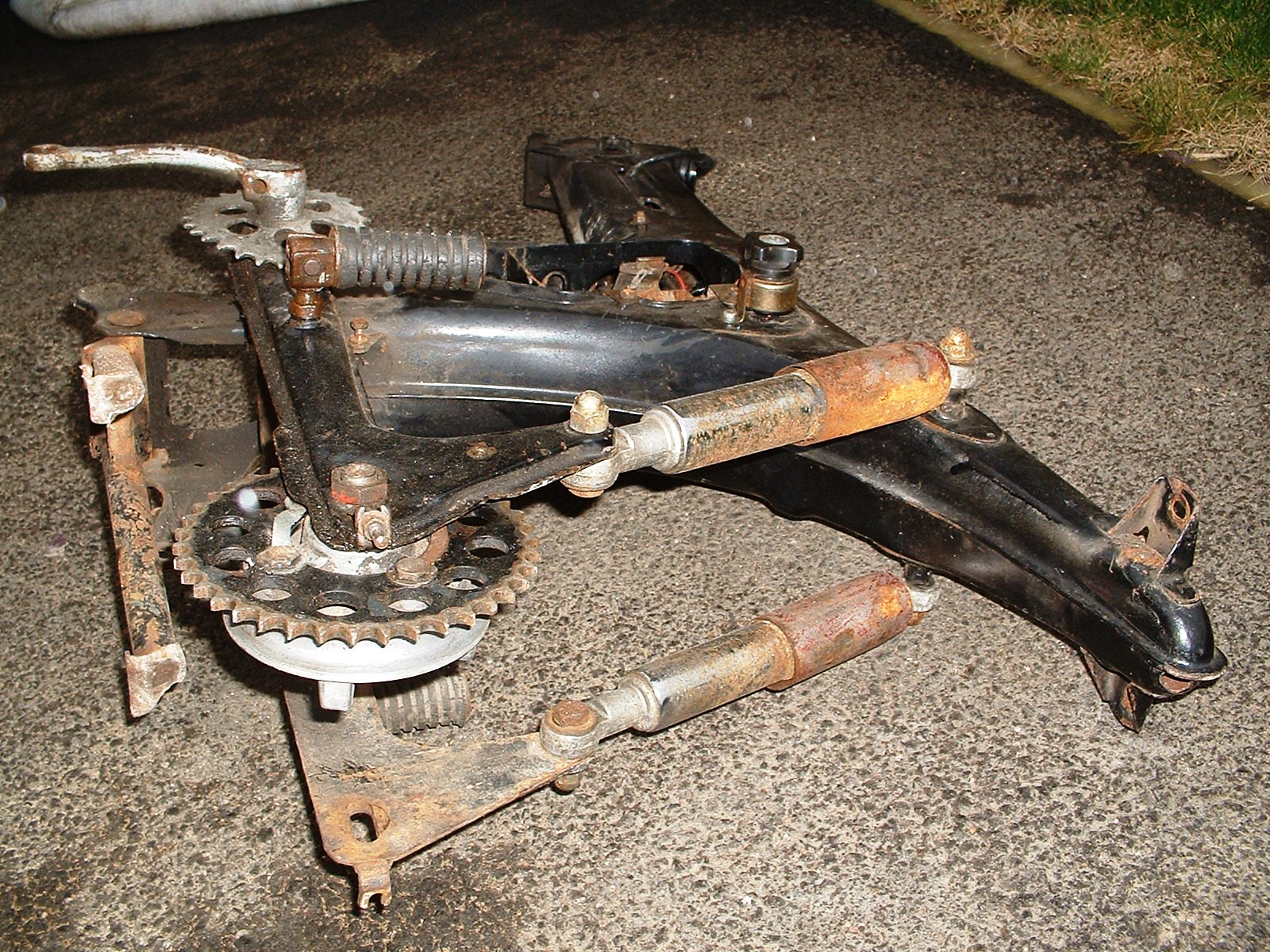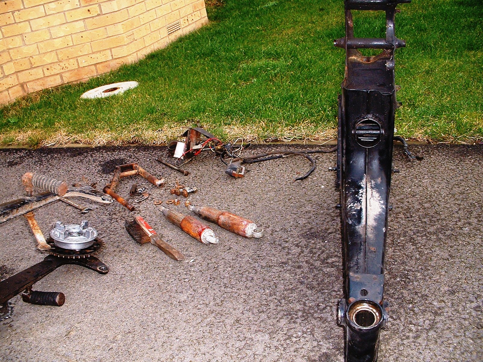 So I thought I would get busy (seeing as it wasn't actually raining) and strip the frame. I got almost there but the pedal crank shaft will not come out - time to consult the manual, after all there's no point in bashing away at it if doesn't come apart the way I think.....OK, all the bits are ready for painting (well they're going to a local paint shop) and he will give me back the frame and swing arm first, perhaps the silver bits too.